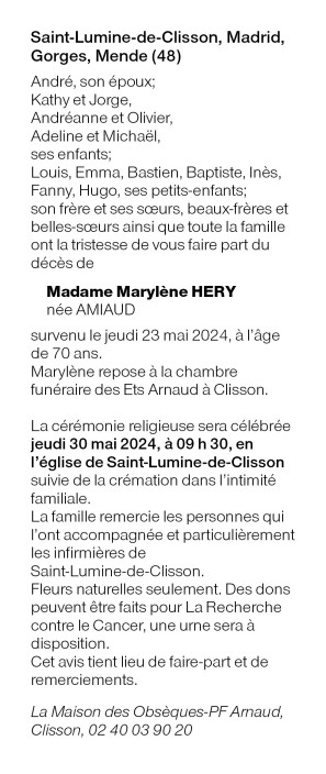 Cet espace « condoléances » est dédié à la mémoire de Madame Marylène HERY née AMIAUD.