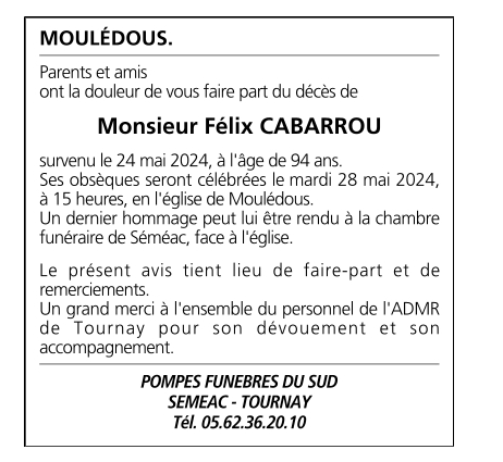 Cet espace « condoléances » est dédié à la mémoire de Monsieur Félix CABARROU.