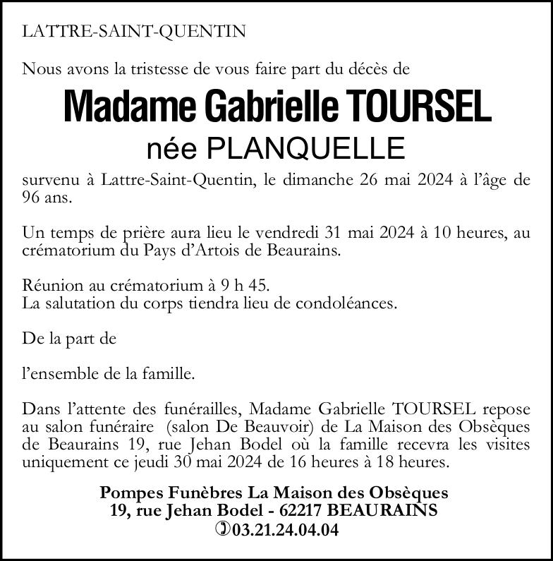 Cet espace « condoléances » est dédié à la mémoire de Madame Gabrielle TOURSEL née PLANQUELLE.