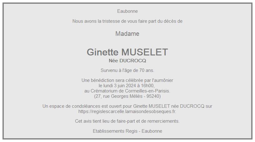 Cet espace « condoléances » est dédié à la mémoire de Madame Ginette MUSELET née DUCROCQ.