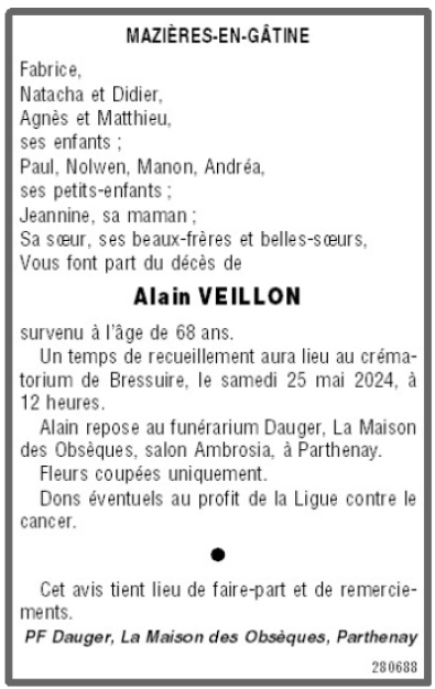 Décédé à Mazières-en-Gâtine (79310) le mercredi 22 mai 2024