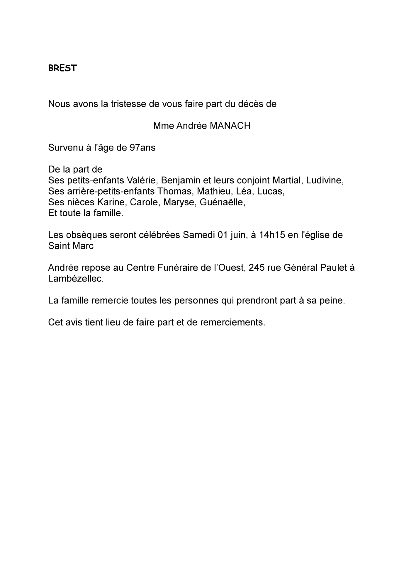 Cet espace « condoléances » est dédié à la mémoire de Madame Andrée MANACH.