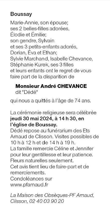 Décédé à Boussay (44190) le vendredi 24 mai 2024