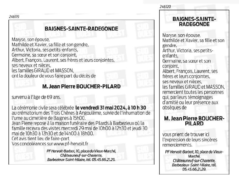 Cet espace « condoléances » est dédié à la mémoire de Monsieur Jean Pierre BOUCHER-PILARD.