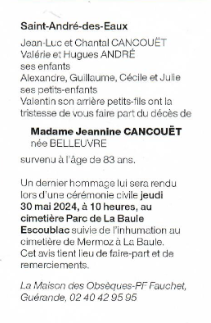 de Madame Jeannine CANCOUET née BELLEUVRE