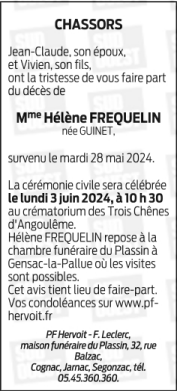 Cet espace « condoléances » est dédié à la mémoire de Madame Hélène FREQUELIN née GUINET.