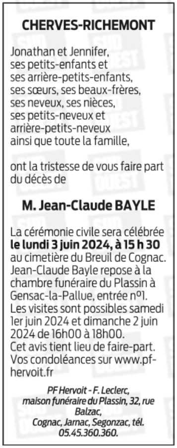 Décédé à Châteaubernard (16100) le mardi 28 mai 2024