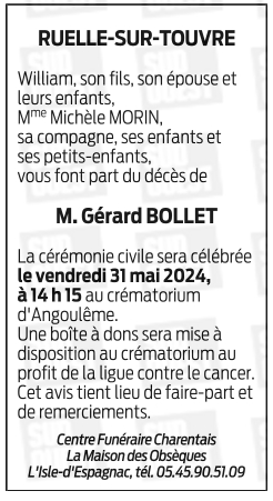 Cet espace « condoléances » est dédié à la mémoire de Monsieur Gerard BOLLET.