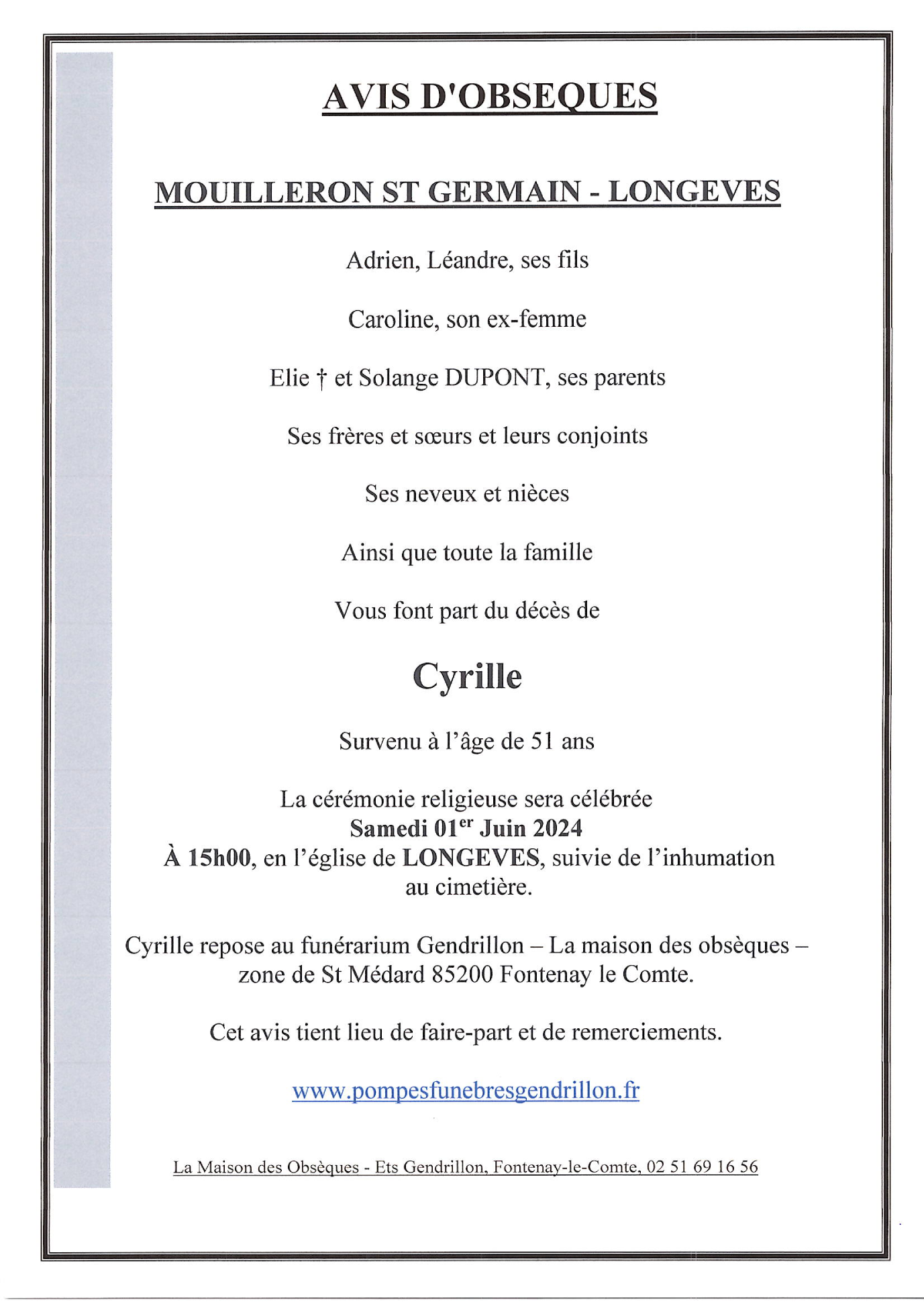 Décédé à Mouilleron en Pareds (85390) le mardi 28 mai 2024