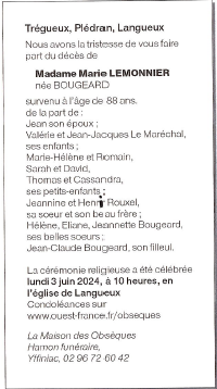 Cet espace « condoléances » est dédié à la mémoire de Madame Marie LEMONNIER née BOUGEARD.