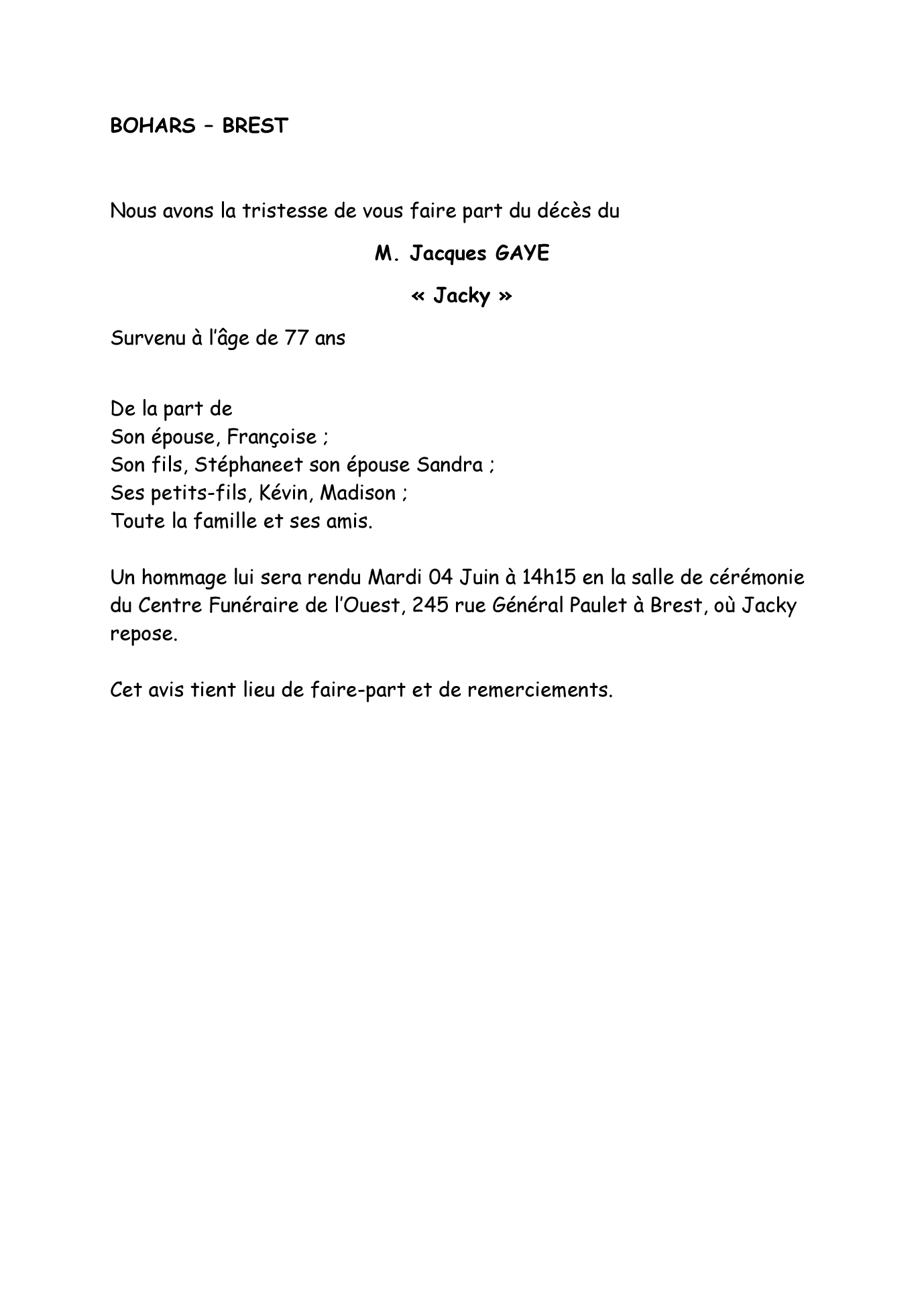 Cet espace « condoléances » est dédié à la mémoire de Monsieur Jacques GAYE.