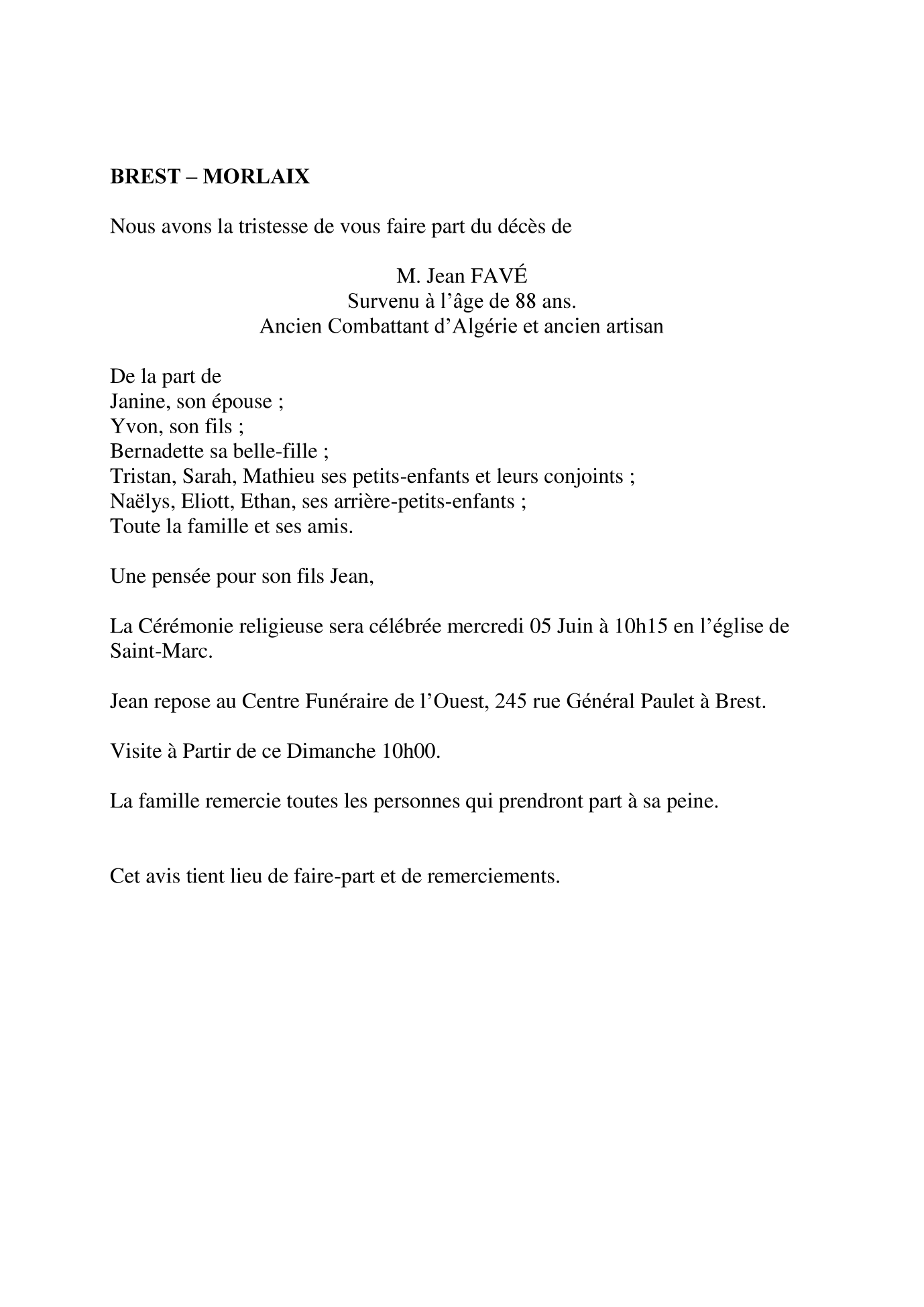 Cet espace « condoléances » est dédié à la mémoire de Monsieur Jean FAVÉ.