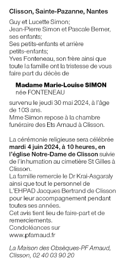 Cet espace « condoléances » est dédié à la mémoire de Madame Marie-Louise SIMON née FONTENEAU.