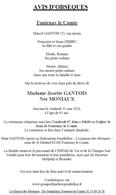 Cet espace « condoléances » est dédié à la mémoire de Madame Josette GANTOIS née MONIAUX.