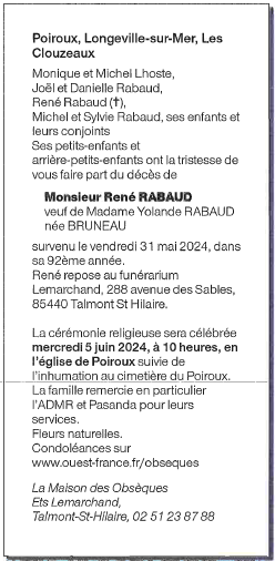 Décédé à Poiroux (85440) le vendredi 31 mai 2024