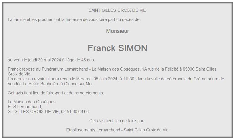 Cet espace « condoléances » est dédié à la mémoire de Monsieur Franck SIMON.