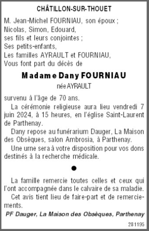 Cet espace « condoléances » est dédié à la mémoire de Madame Danielle FOURNIAU née AYRAULT.