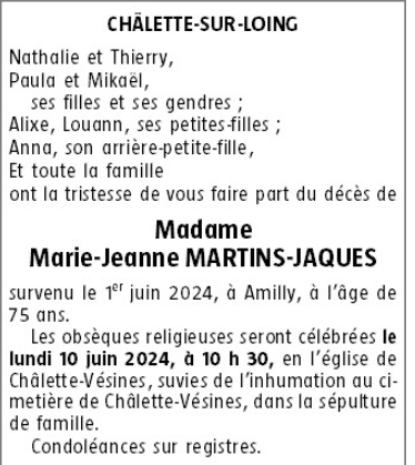 de Madame Marie-Jeanne MARTINS-JAQUES née PATRON