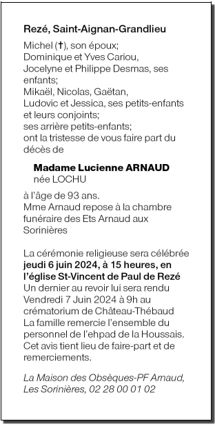 Cet espace « condoléances » est dédié à la mémoire de Madame Lucienne ARNAUD née LOCHU.