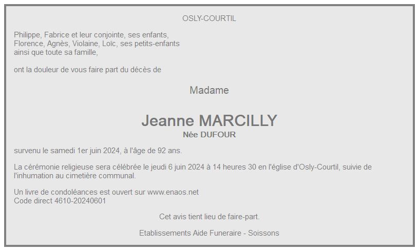Cet espace « condoléances » est dédié à la mémoire de Madame Jeanne MARCILLY née DUFOUR.