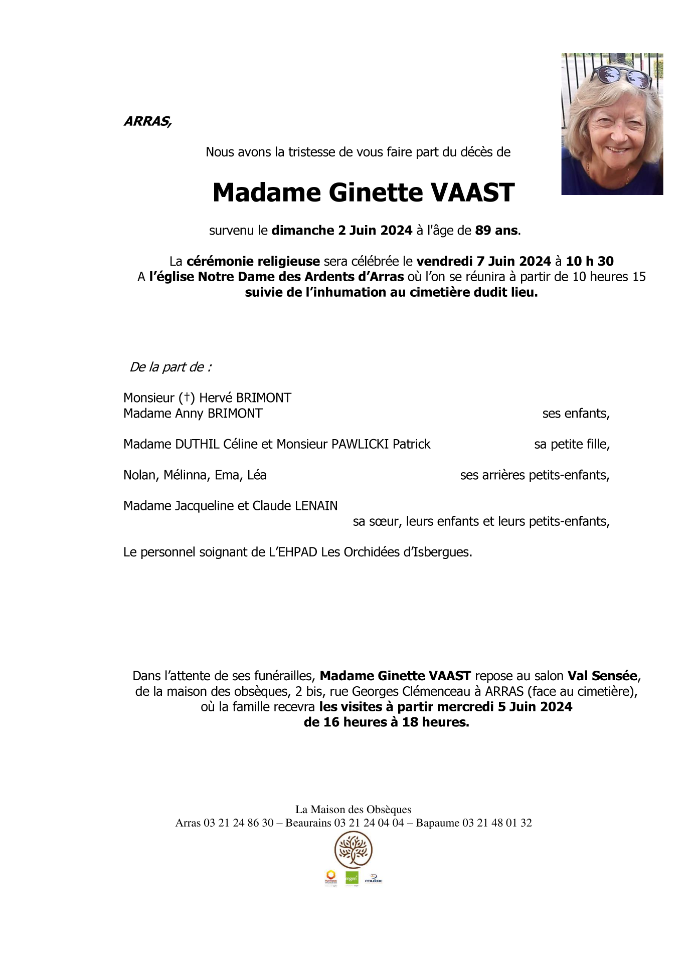 Cet espace « condoléances » est dédié à la mémoire de Madame Ginette née VAAST.