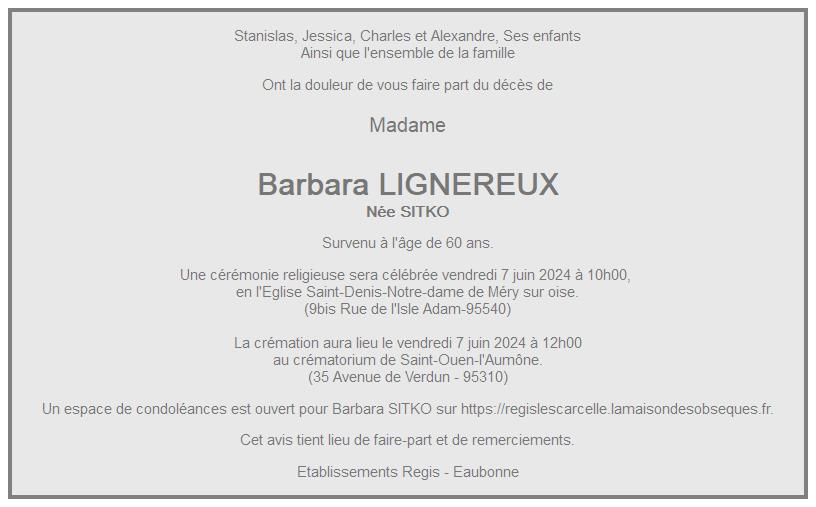Cet espace « condoléances » est dédié à la mémoire de Madame Barbara LIGNEREUX née SITKO.