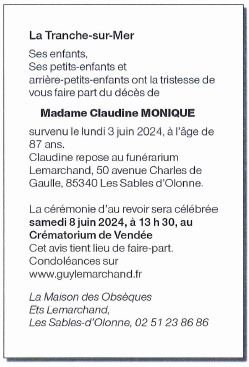 Décédée à La Tranche-sur-Mer (85360) le lundi 3 juin 2024