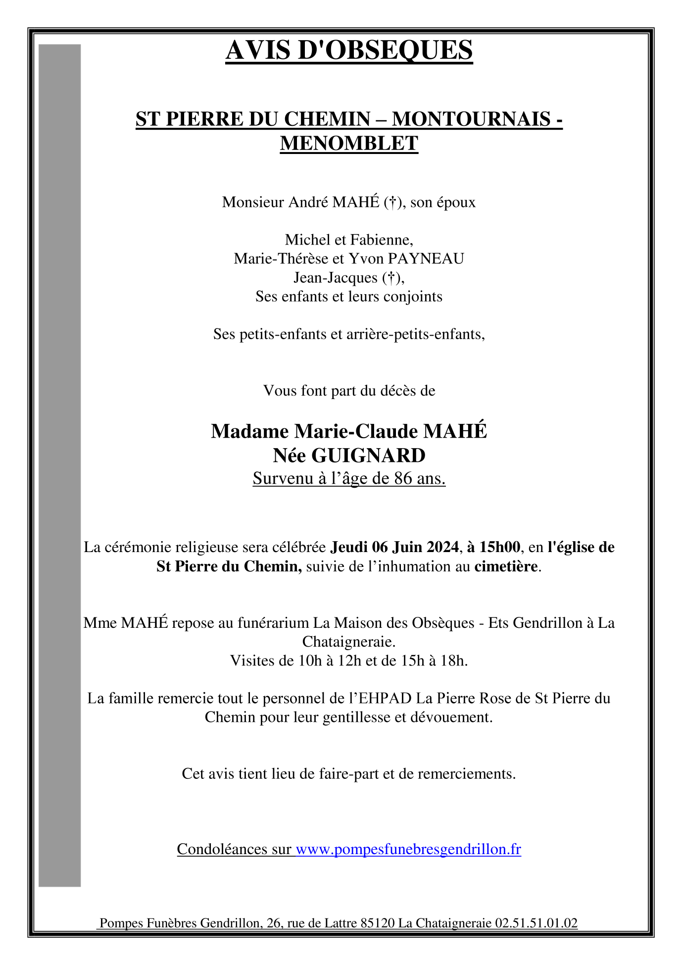 de Madame Marie-Claude MAHÉ née GUIGNARD