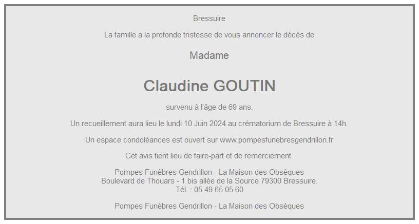 Cet espace « condoléances » est dédié à la mémoire de Madame Claudine GOUTIN.