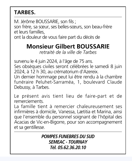 Cet espace « condoléances » est dédié à la mémoire de Monsieur Gilbert BOUSSARIE.