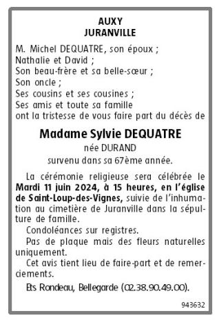 Cet espace « condoléances » est dédié à la mémoire de Madame Sylvie DEQUATRE née DURAND.