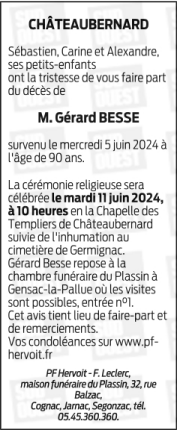 Décédé à Châteaubernard (16100) le mercredi 5 juin 2024