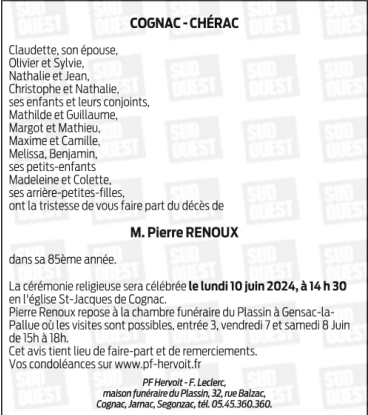 Cet espace « condoléances » est dédié à la mémoire de Monsieur Pierre RENOUX.