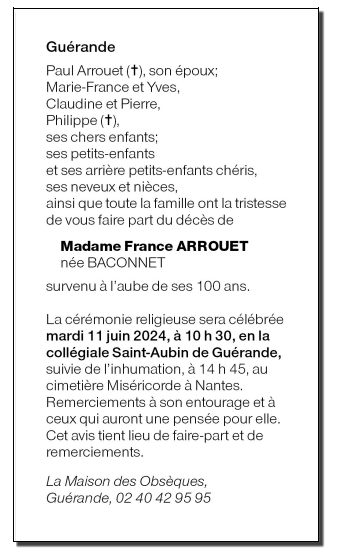 Cet espace « condoléances » est dédié à la mémoire de Madame France ARROUET.