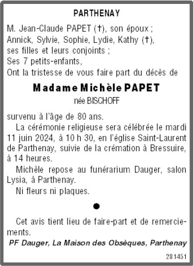 de Madame Michèle PAPET née BISCHOFF