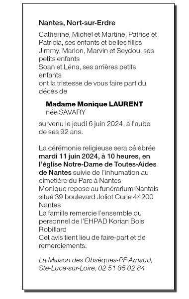 Cet espace « condoléances » est dédié à la mémoire de Madame Monique LAURENT née SAVARY.