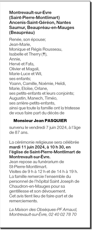 Cet espace « condoléances » est dédié à la mémoire de Monsieur Jean PASQUIER.
