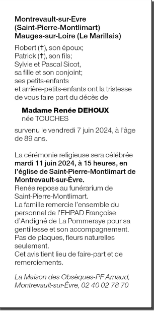 Cet espace « condoléances » est dédié à la mémoire de Madame Renée DEHOUX née TOUCHES.