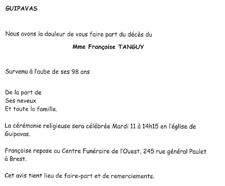 Cet espace « condoléances » est dédié à la mémoire de Madame Françoise TANGUY.