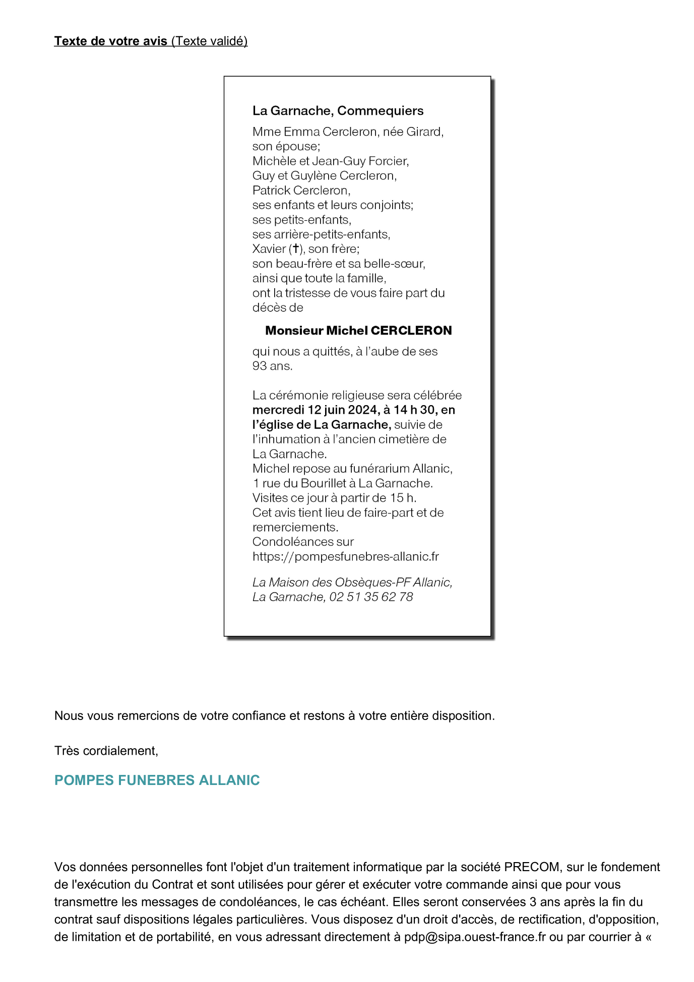 Cet espace « condoléances » est dédié à la mémoire de Monsieur Michel CERCLERON.