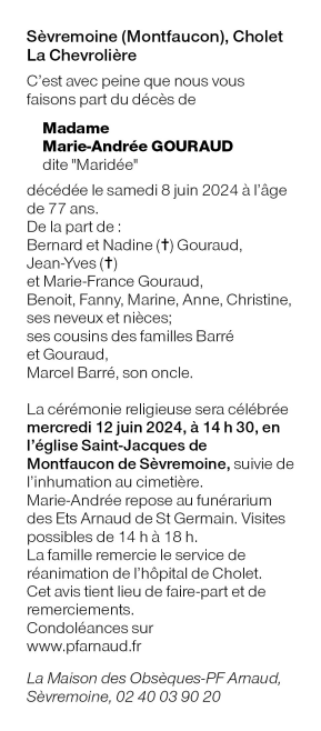 Cet espace « condoléances » est dédié à la mémoire de Madame Marie-Andrée GOURAUD.