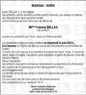 de Madame Yvonne SELLAS née LADRAT