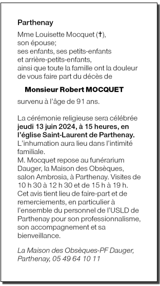 Cet espace « condoléances » est dédié à la mémoire de Monsieur Robert MOCQUET.