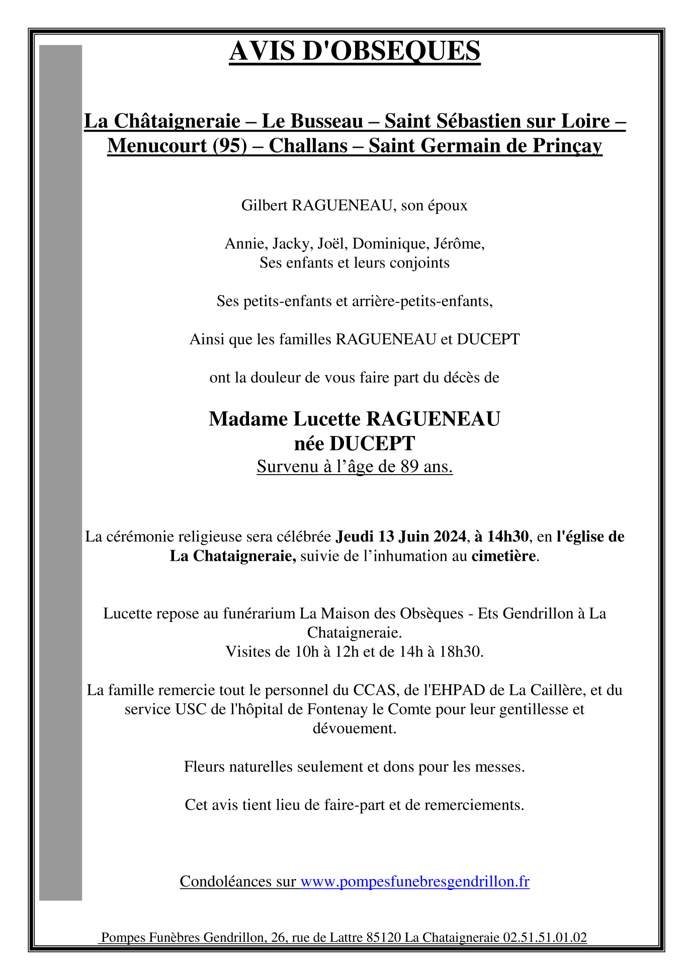 de Madame Lucette RAGUENEAU née DUCEPT
