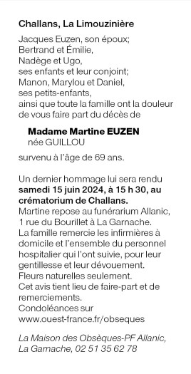 Cet espace « condoléances » est dédié à la mémoire de Madame Martine EUZEN née GUILLOU.