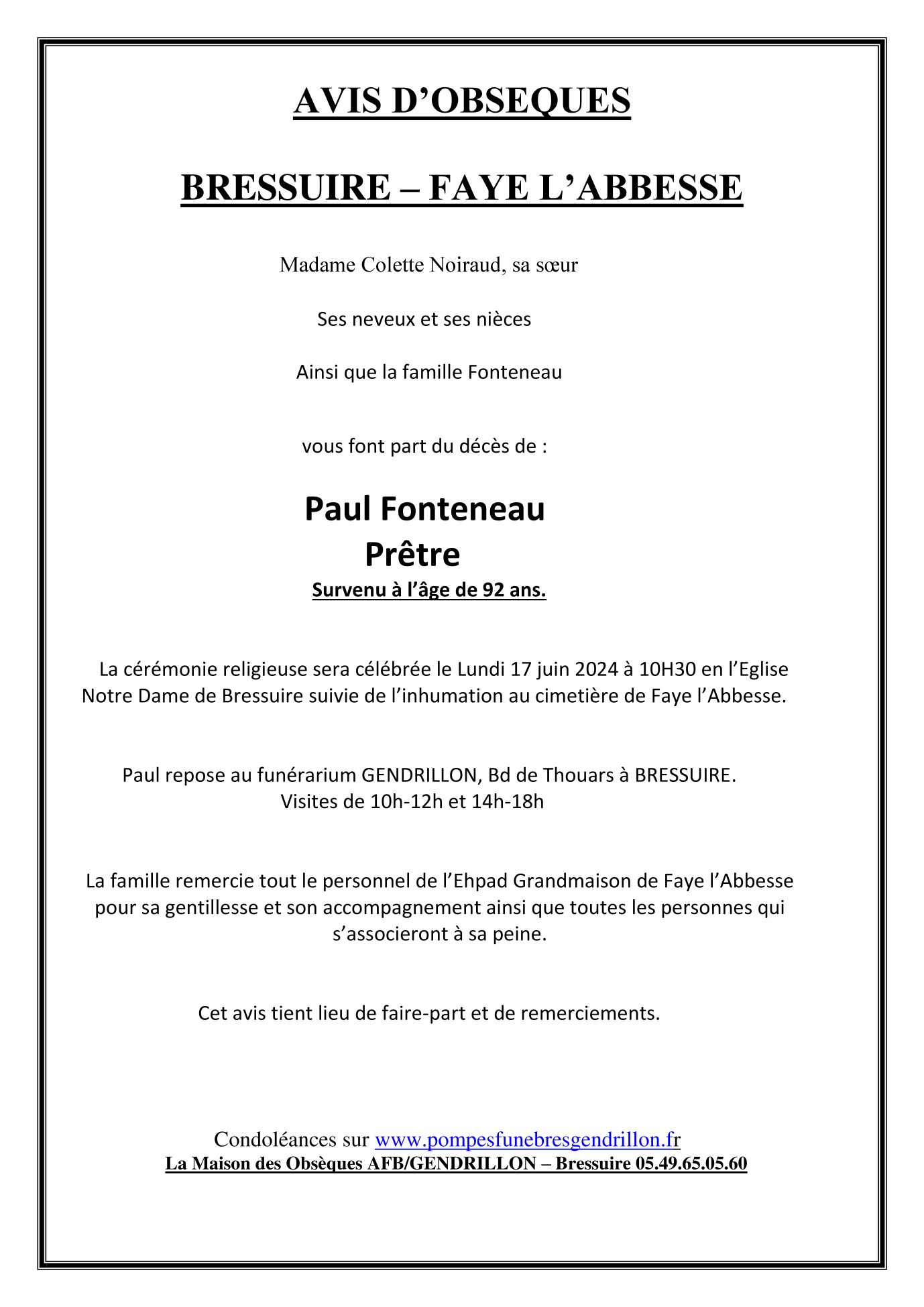 Cet espace « condoléances » est dédié à la mémoire de Prêtre Paul FONTENEAU.