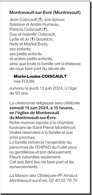 Avis d'obsèques de Mme Coiscault Marie-Louise