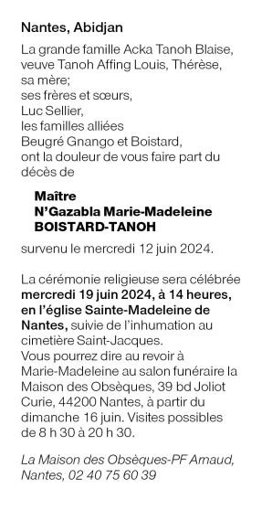 Cet espace « condoléances » est dédié à la mémoire de Madame N'Gazabla TANOH.