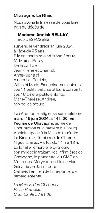 Cet espace « condoléances » est dédié à la mémoire de Madame Annick BELLAY née DESFOSSÉS.