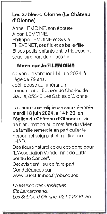 Décédé à Les Sables d'Olonne (85340) le vendredi 14 juin 2024
